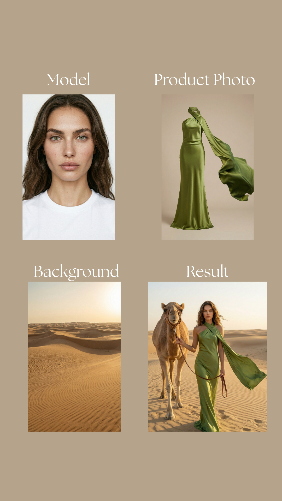 Instead of organising expensive photoshoots, hiring models, booking locations, and managing production costs, we use AI to create premium campaign-style images for your brand. We can place your product in any setting, with any model, and any aesthetic that aligns with your brand vision.